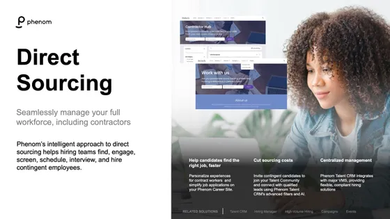 Seamlessly manage your full workforce, including contractors, from a single, user-friendly dashboard within Phenom Talent CRM. Phenom’s intelligent approach to direct sourcing helps hiring teams find, engage, screen, schedule, interview, and hire contingent employees faster.